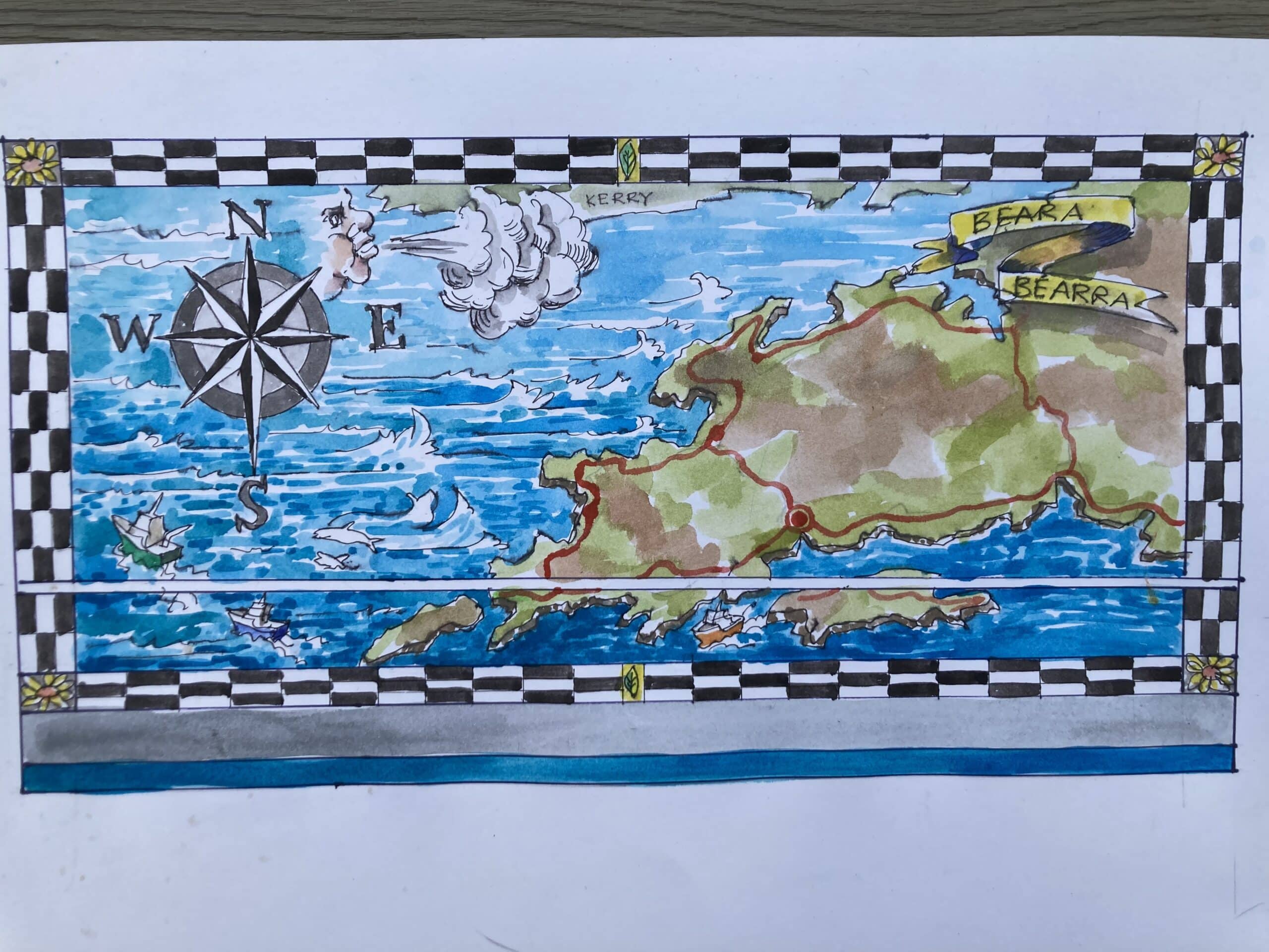 Residents and staff at Castletownbere Community Hospital have spent the summer working alongside Arts for Health Artist Michael Greenlaw to create this beautiful map of Beara mural.