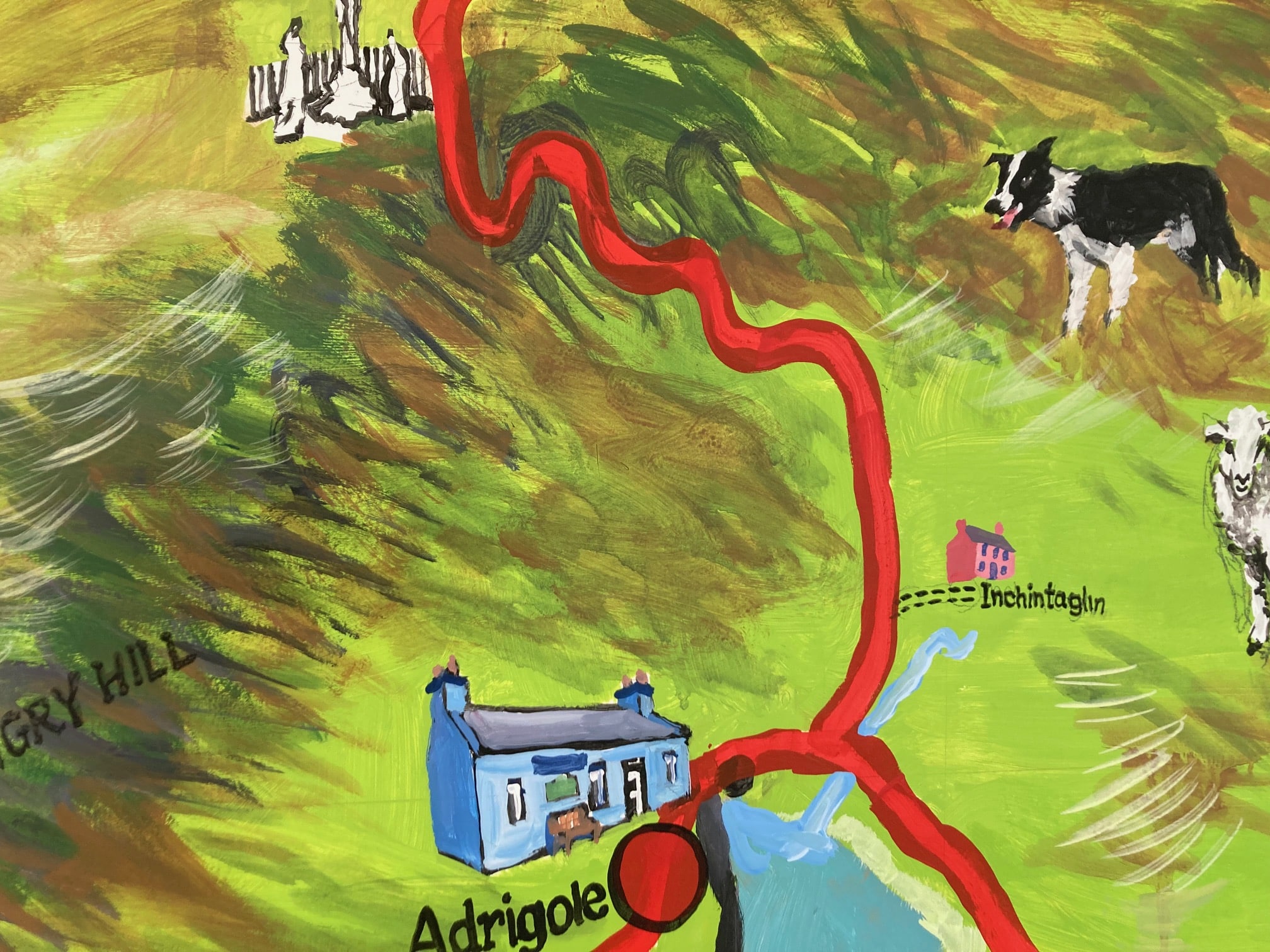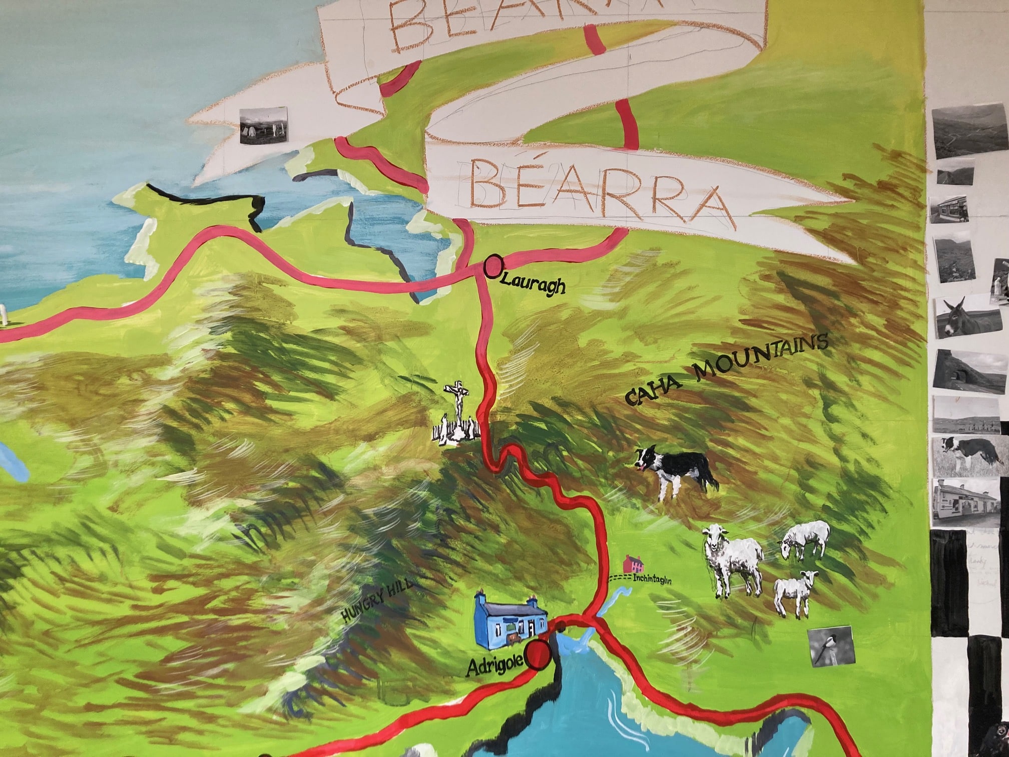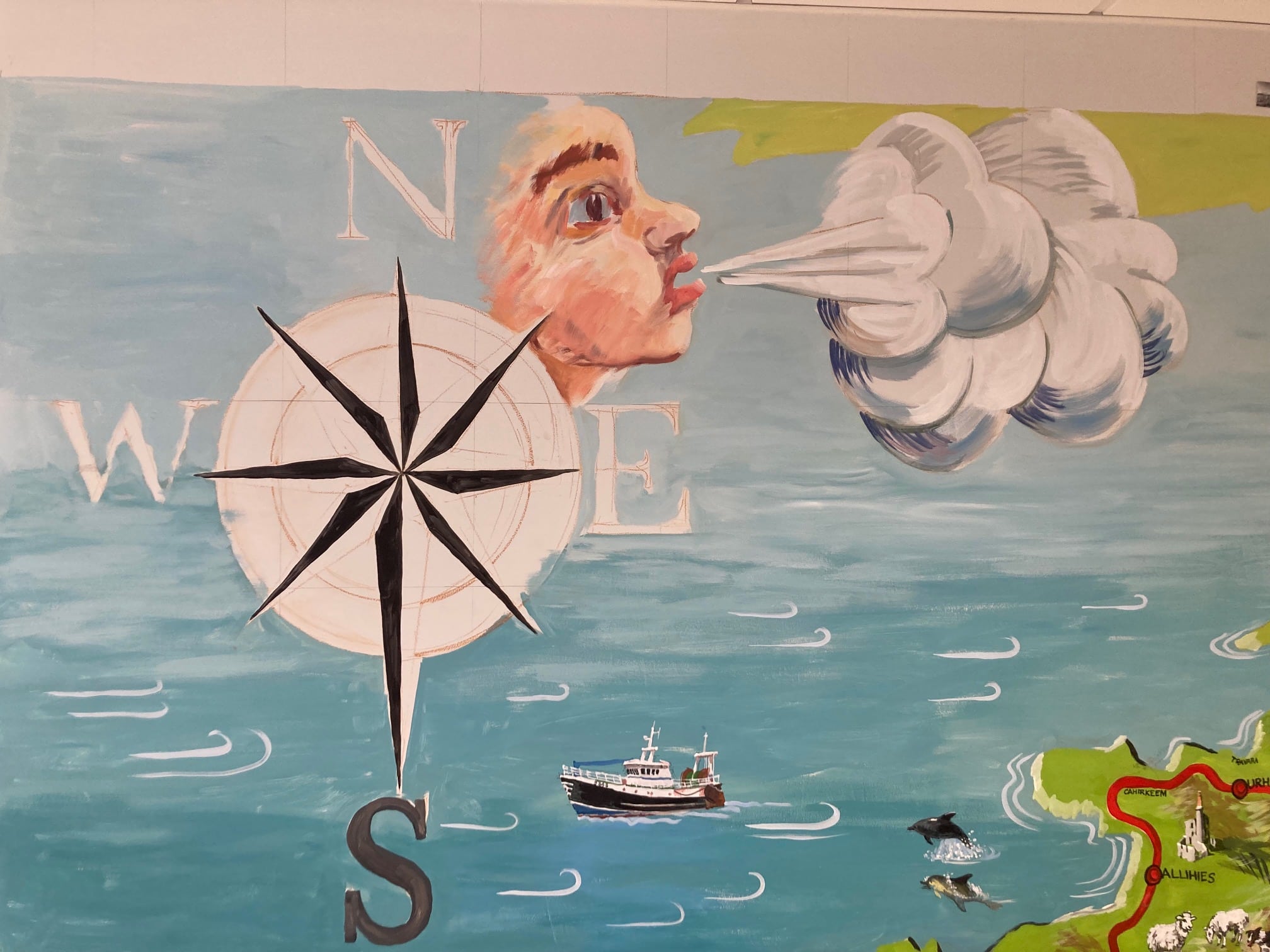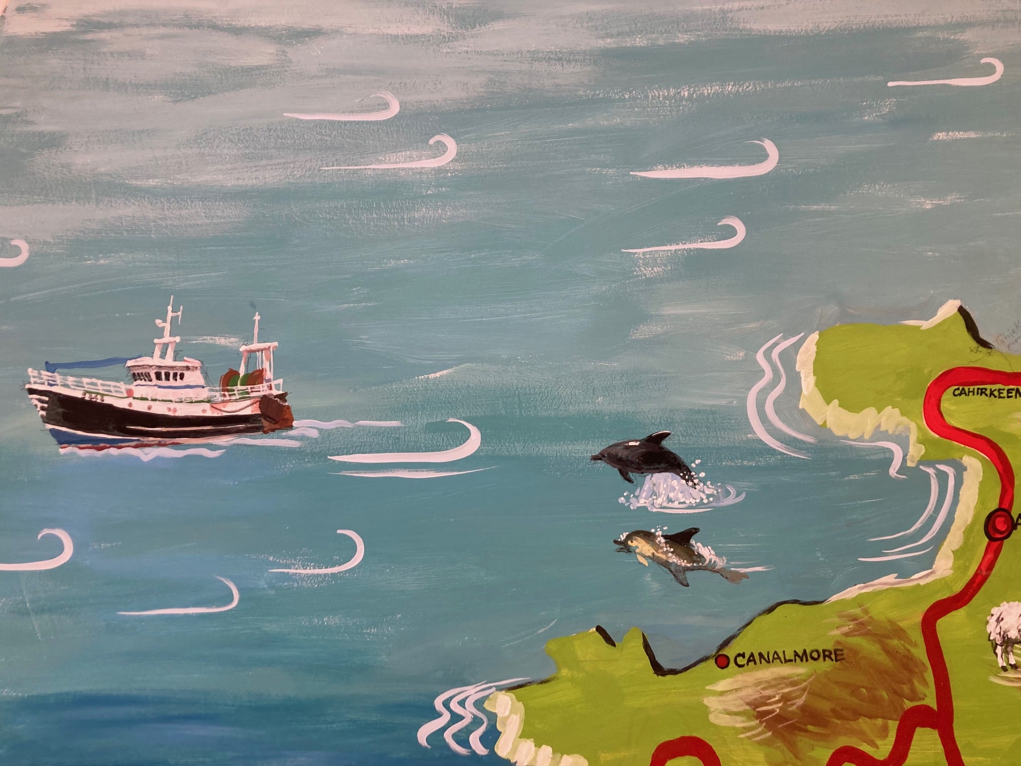 Michael said the project has been a great way to initiate conversation and storytelling, with residents sharing stories about fishing boats named after people, sheep dogs and pets, and the local GAA team, the Magpies! Michael noted, “One of my best moments on the mural was early on, just after the outline of the map had been painted in, when I came in one day to find the mural covered in small images of the local area – gleaned from the internet; this was a great example of how the mural could be an interactive experience.”